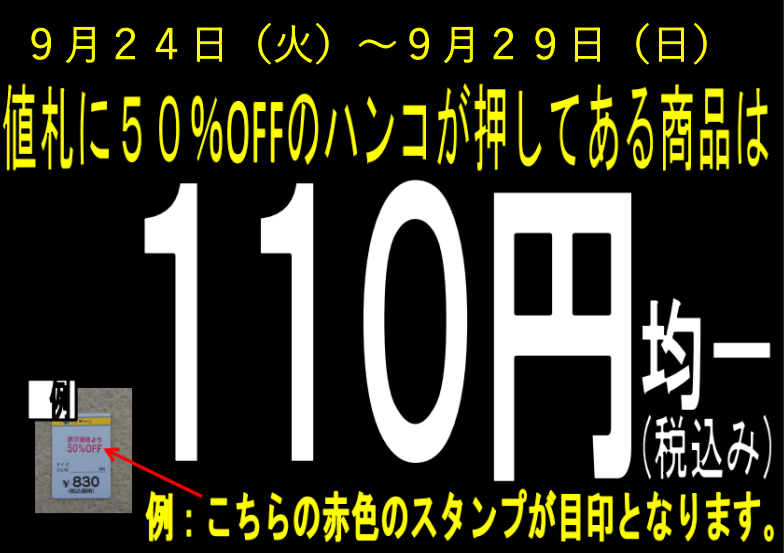 50%OFFハンコが押してある古着が全品110円均一となります!!※170円の50%OFFは値札の表示通りレジ打ちいたします