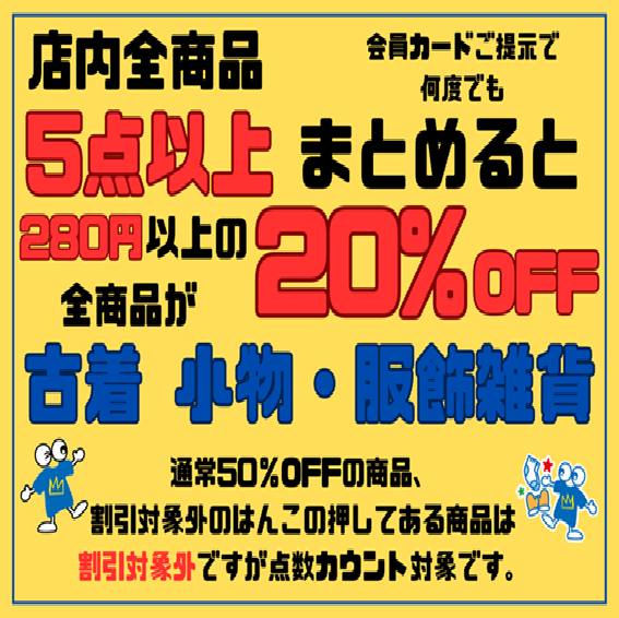 会員カードご提示で店内のお好きな商品を1会計5点以上ご購入いただくと280円以上の商品が全品20%OFF会員カードご提示で何度でも279円以下の全商品、通常50%OFFの商品、均一価格の商品は対象外です。点数カウントは対象です。