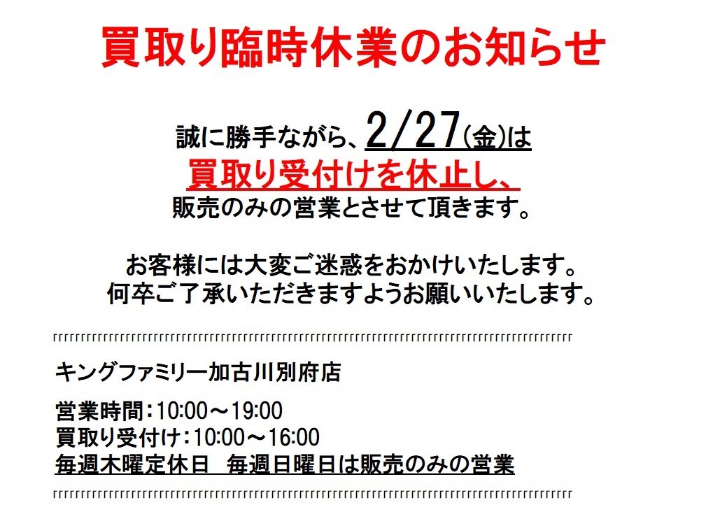 誠に勝手ながら、2/27(金)は買取り受付けを休止し、販売のみの営業とさせていただきます。