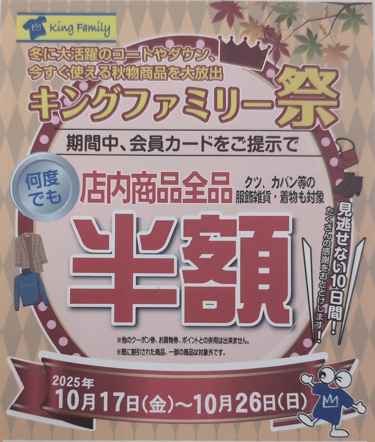 ☆半額☆でお買い物できるキングファミリー祭開催です(^▽^)/