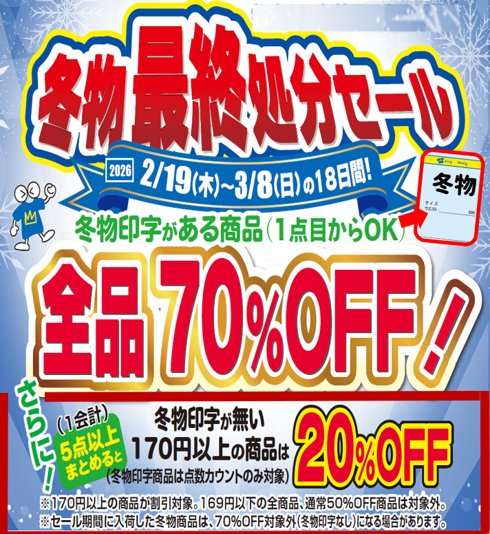 2/19(木)以降入荷した冬物商品は冬物印字を押さず70%OFF対象外になっておりますご了承ください。