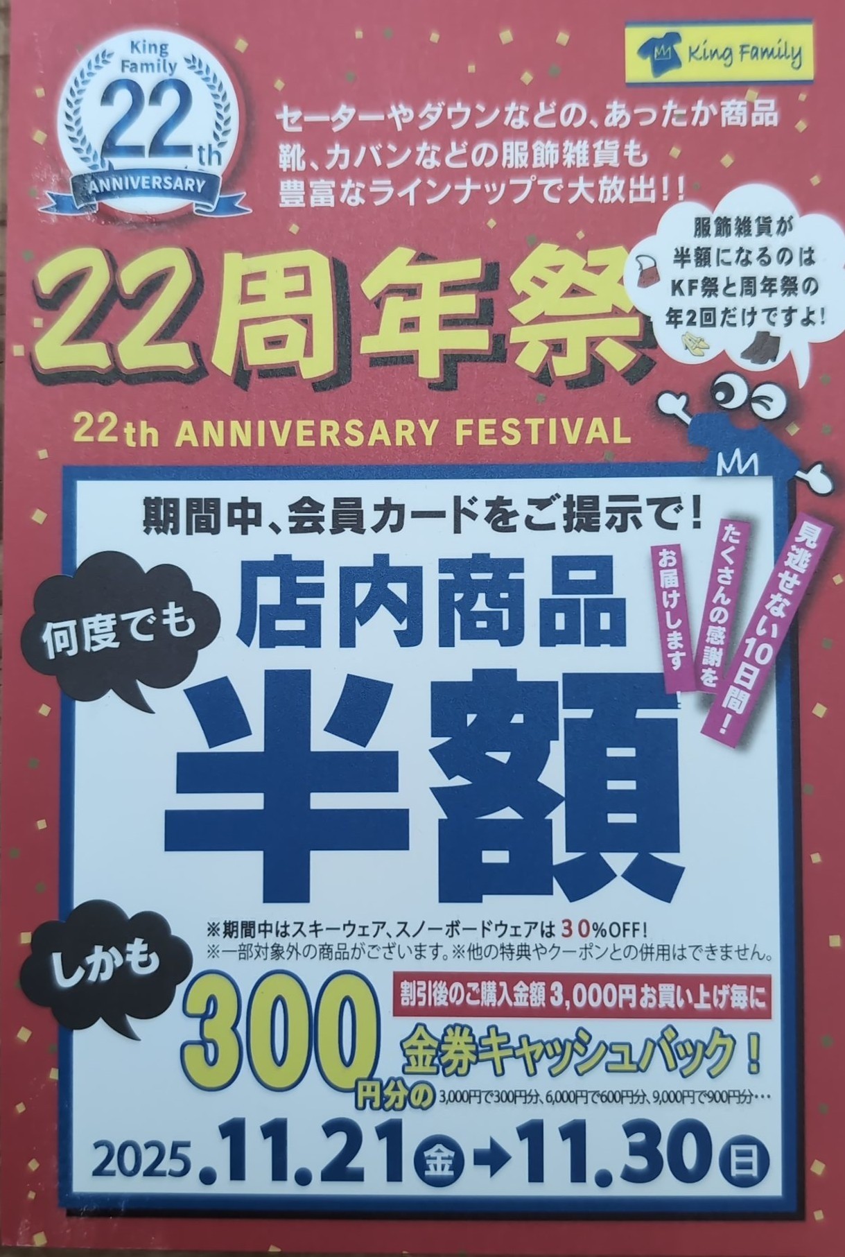 ☆おかげさまで22周年☆キングファミリー周年祭☆全品半額♪☆