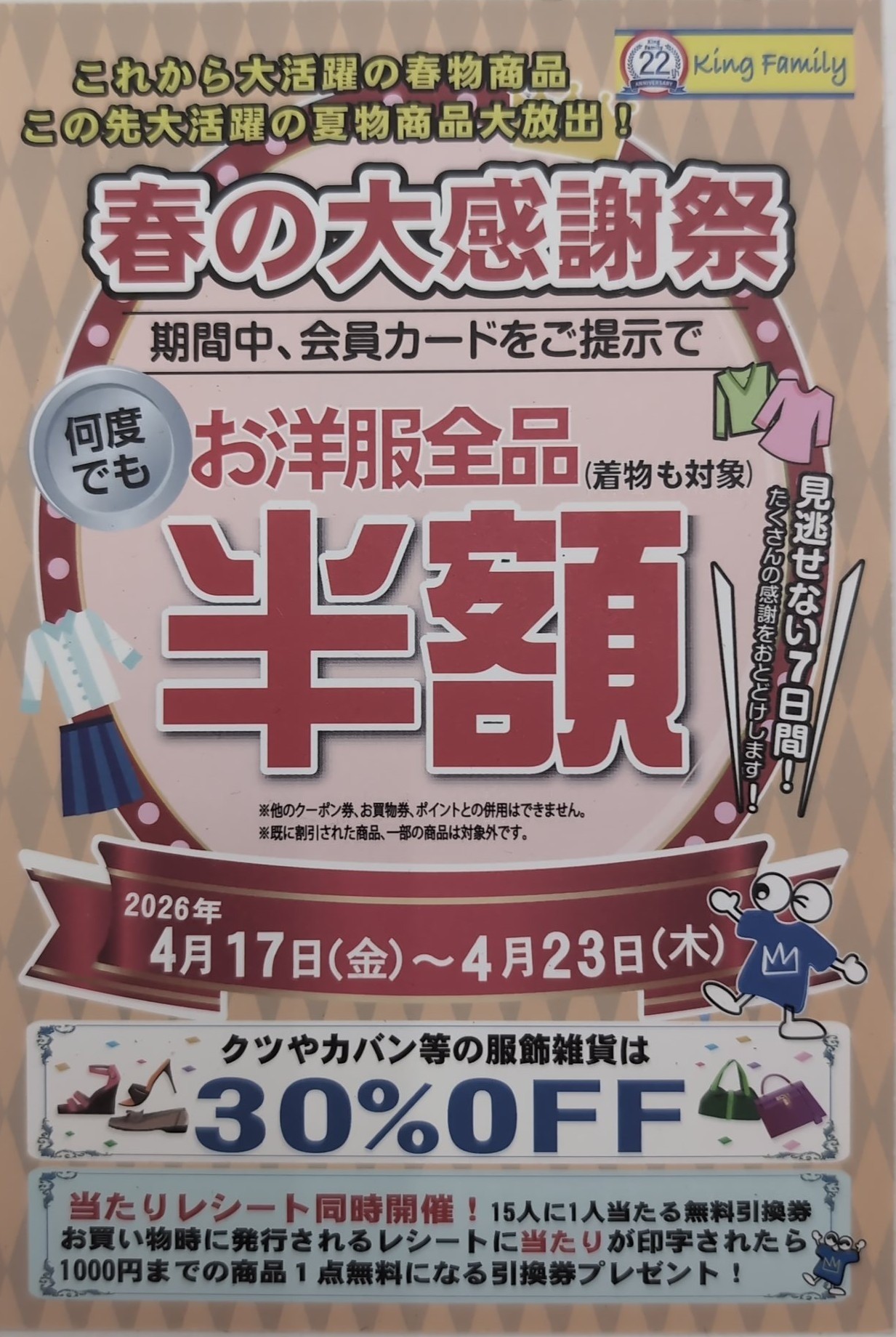 ☆衣類全品半額☆カバンやクツ等の服飾雑貨も全品30%OFF☆春の大感謝祭☆