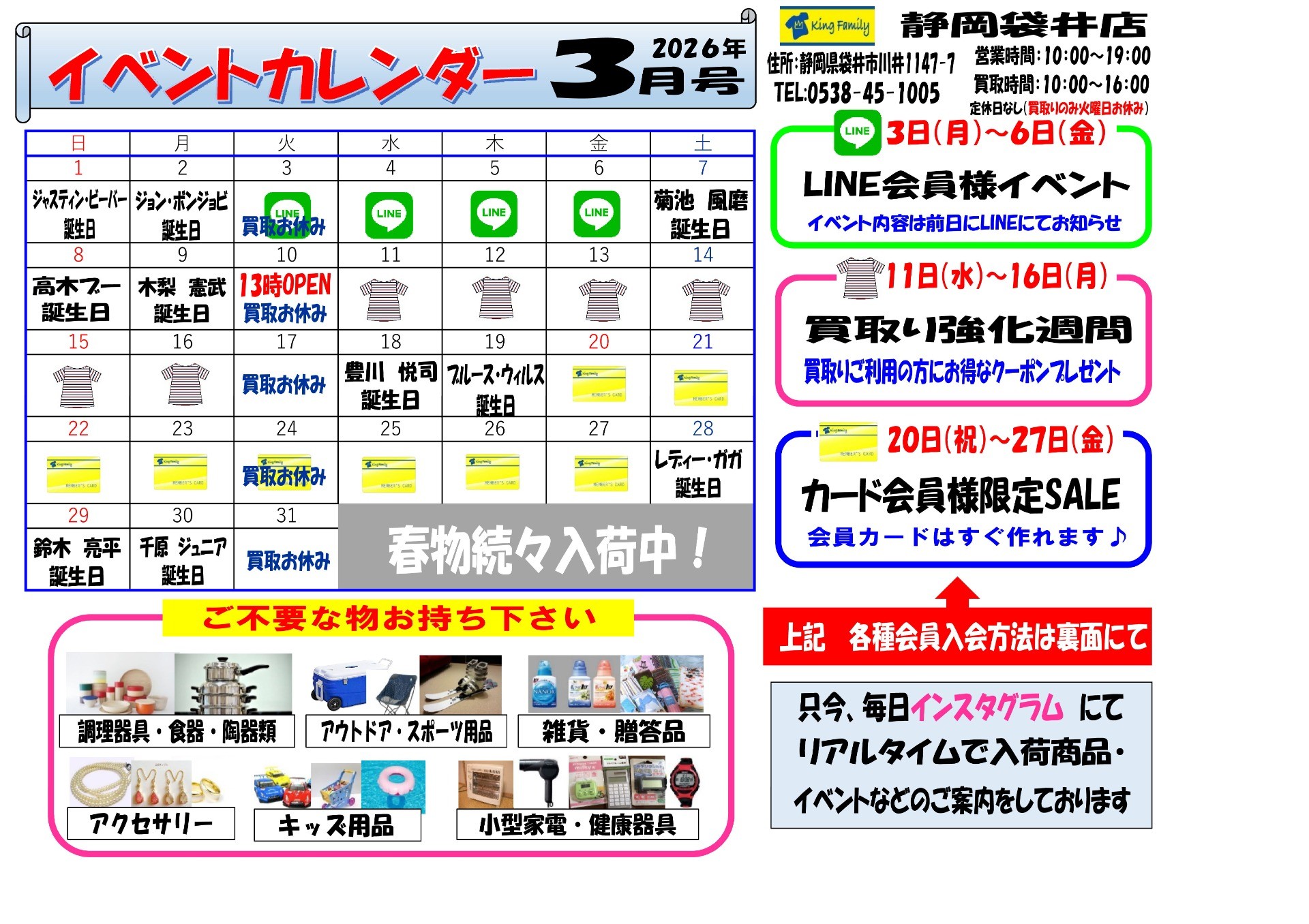 3月も毎週お得なイベントを開催中!セールの内容はLINE会員様限定でお知らせしていますので要チェック☆静岡袋井店では古着や小物など、各種アイテムを1万点以上ご用意して皆様のご来店をお待ちしております!