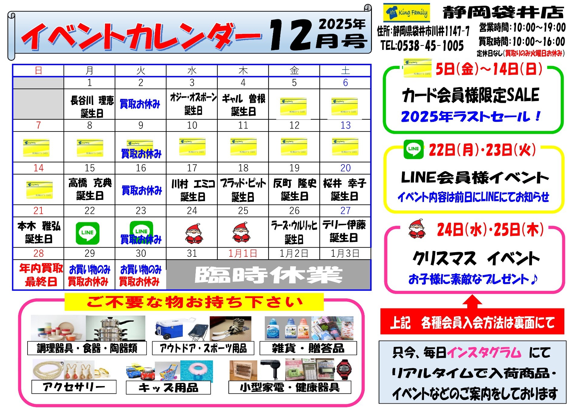 12月も毎週お得なイベントを開催中!セールの内容はLINE会員様限定でお知らせしていますので要チェック☆静岡袋井店では古着や小物など、各種アイテムを1万点以上ご用意して皆様のご来店をお待ちしております!